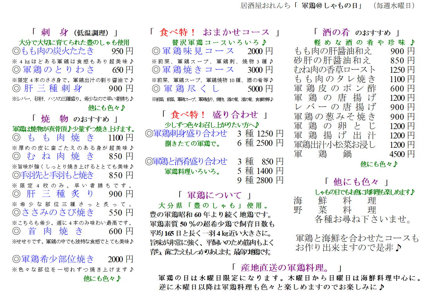 本日3月25日より、産地直送軍鶏料理復活しました。大分から一羽4sほどの大物軍鶏が毎週二羽届きます。丸どりから捌きだし部位ごとに色々な軍鶏料理をお作りします。