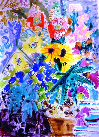 ひまわりとブルーの小花